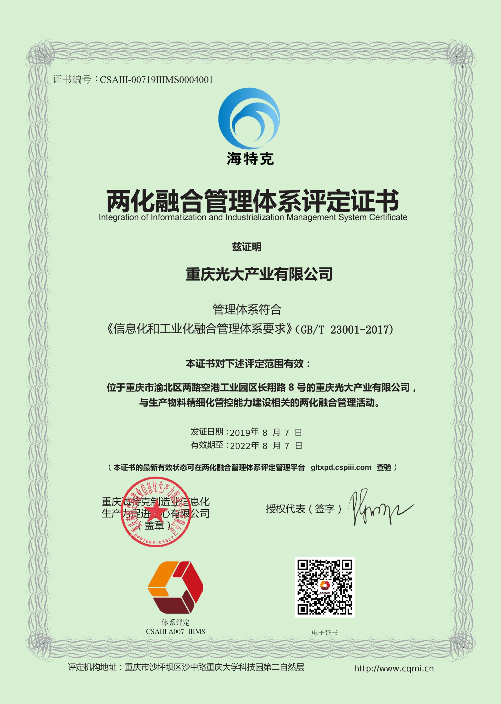 2019年8月7日,重慶光大產(chǎn)業(yè)有限公司順利通過兩化融合管理體系貫標評定,獲得由國家工信部授權的評定機構——重慶海特克制造業(yè)信息化生產(chǎn)力促進中心頒發(fā)的GB/T 23001-2017 “兩化融合管理體系評定證書”,這標志著公司在推進信息化和工業(yè)化融合方面取得了新突破。